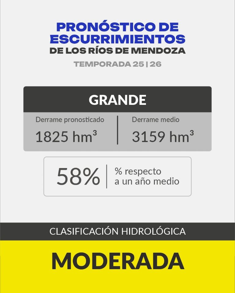 Para el río Grande también se pronosticó una sequía hidrológica moderada con 1.825 hm3, es el 58% del promedio que llega a los 3.159hm3. Esto a pesar de que la estación Valle Hermoso fue la única de todas que resultó con un nivel de nevadas escasas y no con sequía meteorológica moderada como en el resto de las estaciones.