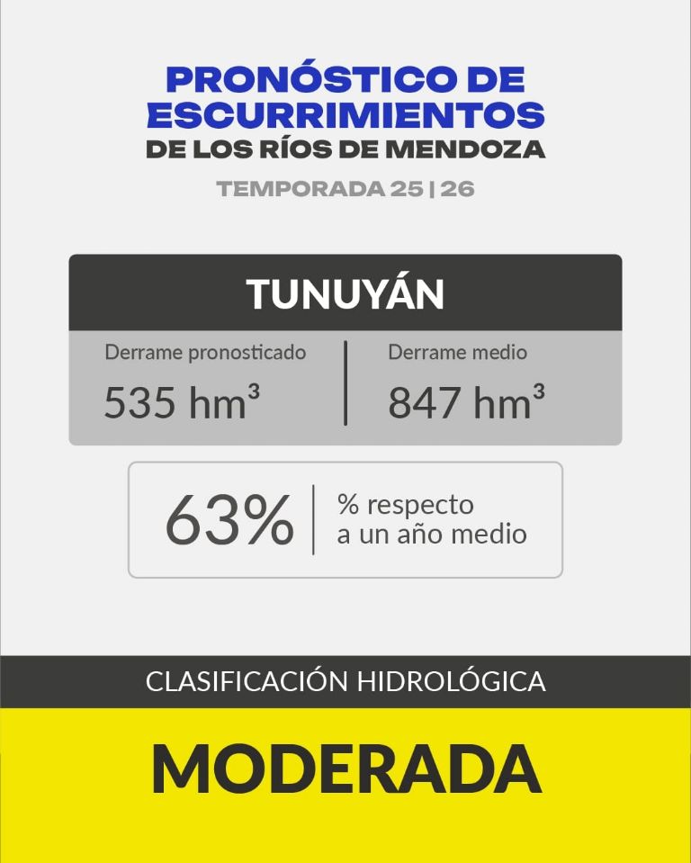 Por su parte para el río Tunuyán, sumando los arroyos, se pronosticó 1.220 hm3, un 69% del promedio.