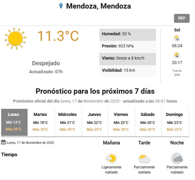 El pronóstico extendido del SMN para la provincia de Mendoza sugiere que la ola de calor continuará e incluso se intensificará. Para el martes, se espera un día caluroso y algo nublado, con una máxima que podría alcanzar los 35°, aunque con un indicio de inestabilidad hacia la noche.