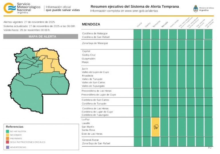El día jueves en Mendoza mantendrá la tónica de altas temperaturas, con una jornada muy calurosa. El Servicio Meteorológico Nacional (SMN) ha emitido una alerta amarilla por la probabilidad de tormentas aisladas hacia la tarde y noche, instando a la población a tomar precauciones ante la inestabilidad que se espera.