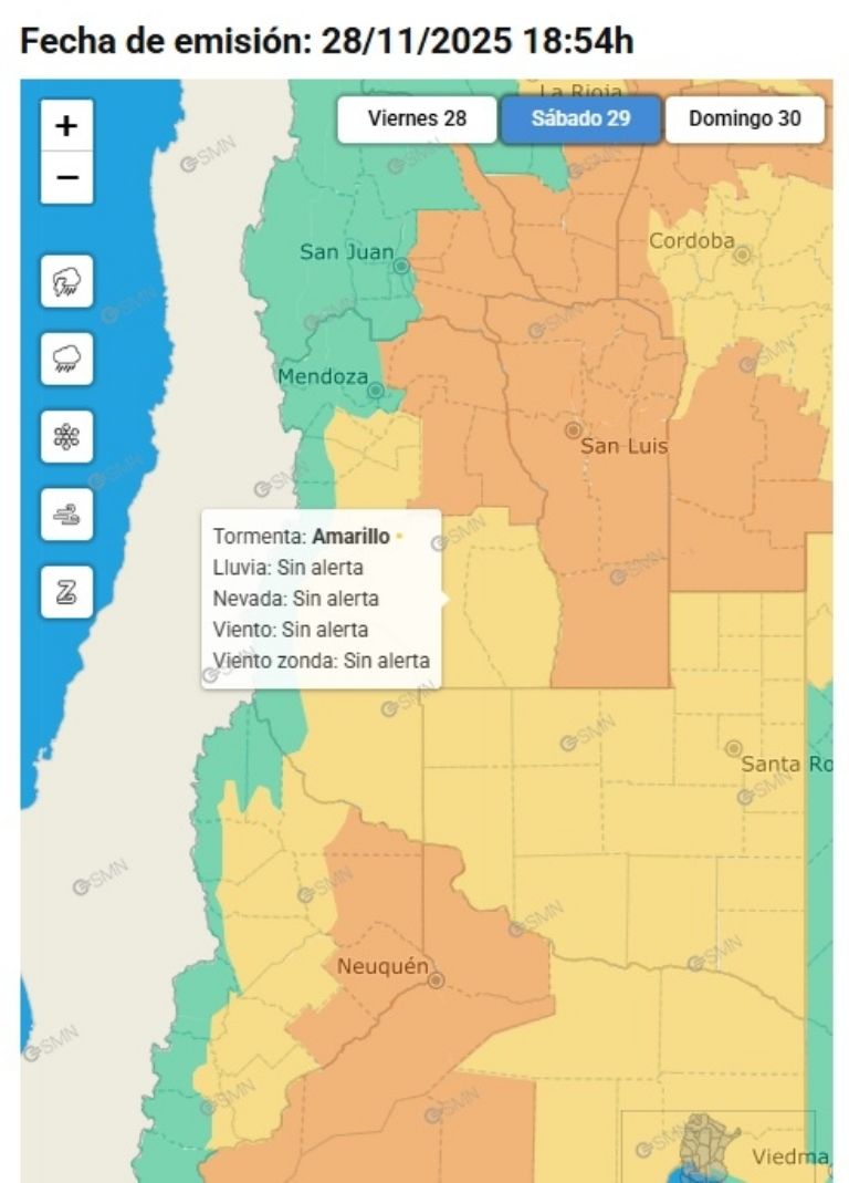 El Servicio Meteorológico Nacional lanzó dos alertas por tormentas para el sábadopara Mendoza. Una amarilla en Valle de Uco y en el Sur de la provincia y una naranja en el Noreste.