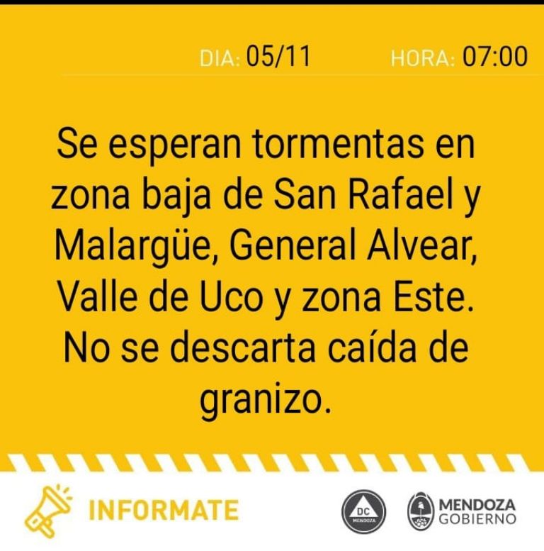 El SMN ha emitido una alerta de nivel amarillo por tormentas que afecta específicamente a la zona baja de San Rafael y General Alvear.