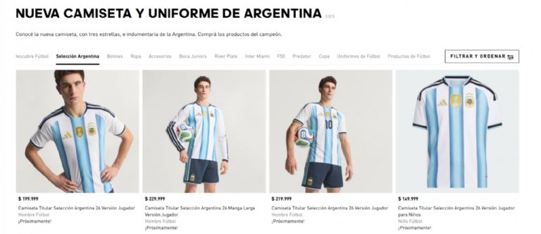 El sector más caro es el de la indumentaria de hombre. La "Camiseta Titular Selección Argentina 26 Versión Jugador" tiene un precio de $199.999. Si el hincha busca la versión de manga larga, el precio asciende a $229.999, mientras que la versión jugador con el número 10 de Messi cuesta $219.999.