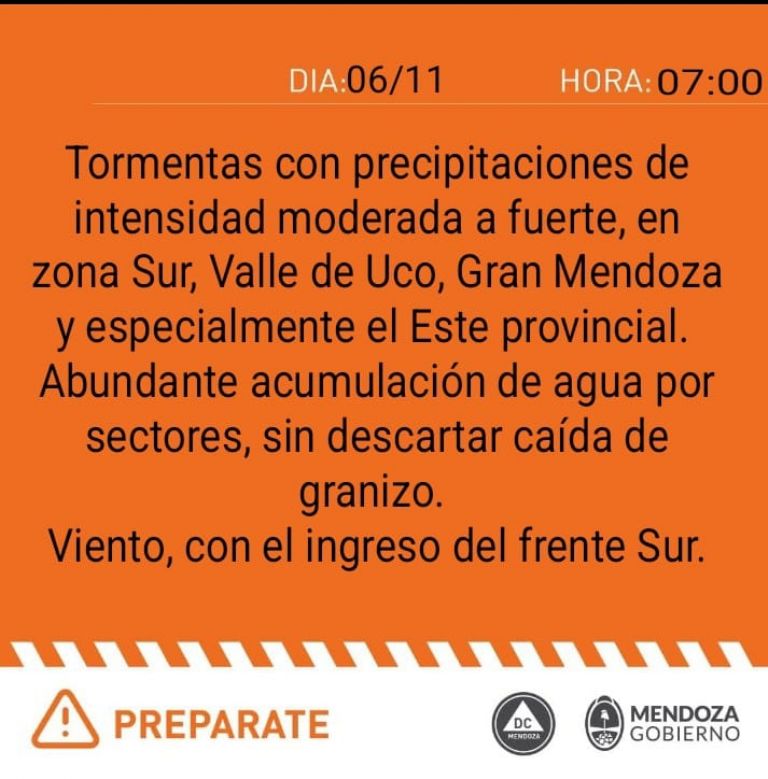 - Alerta amarilla: abarca regiones como Junín, Rivadavia, los Valles de Luján de Cuyo, San Carlos, Tunuyán y Tupungato, así como General Alvear y la zona baja de San Rafael. Aquí, las tormentas aisladas serán localmente fuertes, con posibles abundantes lluvias en cortos períodos (20 a 40 mm), granizo, ráfagas de hasta 70 km/h y frecuente actividad eléctrica.
