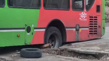 La mañana de este viernes se vio alterada para los usuarios del transporte público cuando la rueda trasera de un colectivo de línea quedó completamente enterrada en un pozo ubicado en la calle Almirante Brown, casi en su intersección con Boulogne Sur Mer.