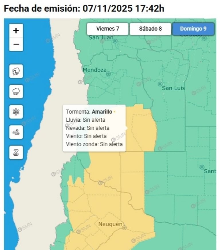 En tanto, el Servicio Meteorológico Nacional lanzó una alerta amarilla por tormentas en Malargüe para el sábado y una alerta amarilla, también por tormentas, para domingo que abarca Malargüe, San Rafael y Alvear.