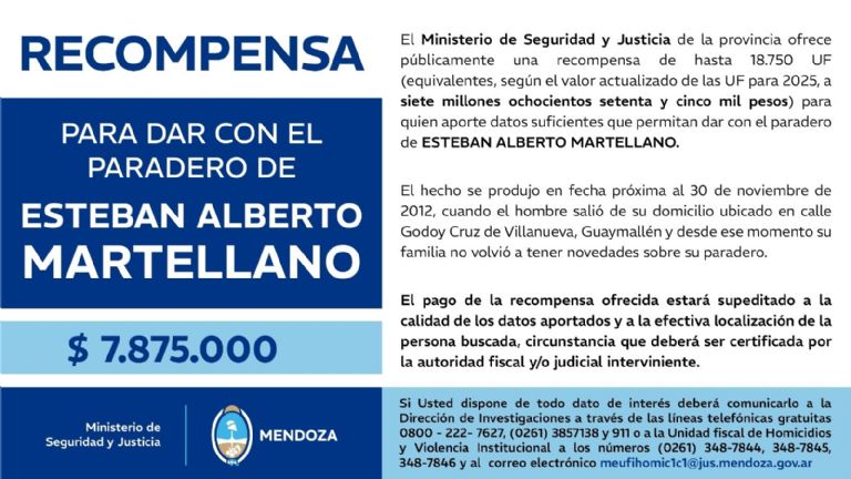 En un esfuerzo por destrabar una causa que lleva más de una década sin respuestas, el Ministerio de Seguridad y Justicia de Mendoza oficializó el ofrecimiento de una importante recompensa pública. El objetivo es obtener datos precisos que ayuden a dar con el paradero de Esteban Alberto Martellano, un vecino de Guaymallén de quien no se tiene rastro desde finales de 2012.