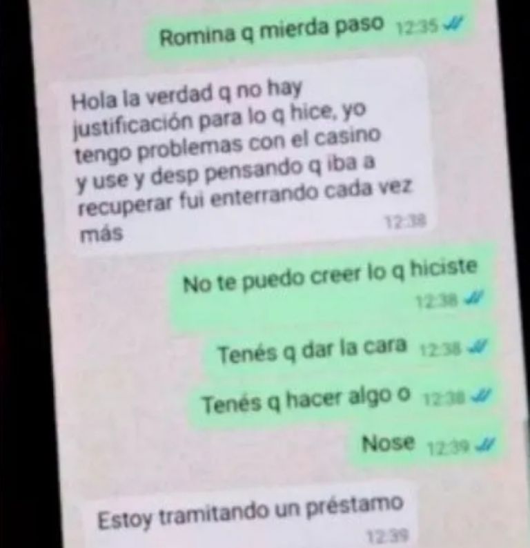 En el mismo mensaje, la misma persona que asumió la responsabilidad de custodiar el dinero admitió que se considera ludópata: ”Yo tengo problemas con el casino,y usé -el dinero- y después, pensando que lo iba a recuperar, fui enterrando cada vez más”.