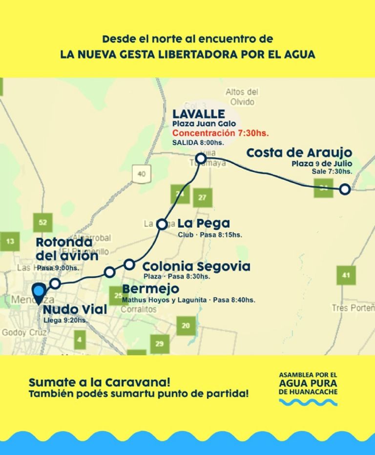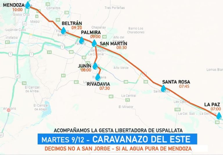Asambleas en defensa del agua de los cinco departamentos del Este: Rivadavia, Junín,San Martín, Santa Rosa y la Paz; tras varios días de deliberaciones decidieron salir en caravana, y unirse a la Gesta Libertadora por el Agua en rechazo a la aprobación de la Declaracion de Impacto Ambiental para el proyecto San Jorge en Uspallata, que ya cuenta con media sanción.