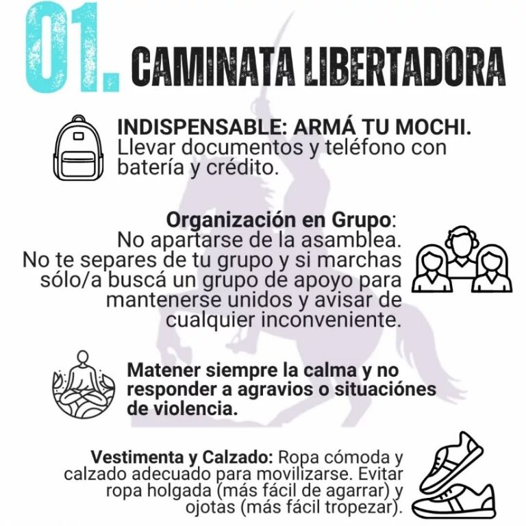 La primera recomendación es el armado de la mochila con documentos, celular cargado y crédito. En los posteos también recomiendan a los manifestantes mantenerse unidos y con calma durante la marcha y la posterior manifestación. También realizan sugerencias sobre la ropa y el calzado adecuado.