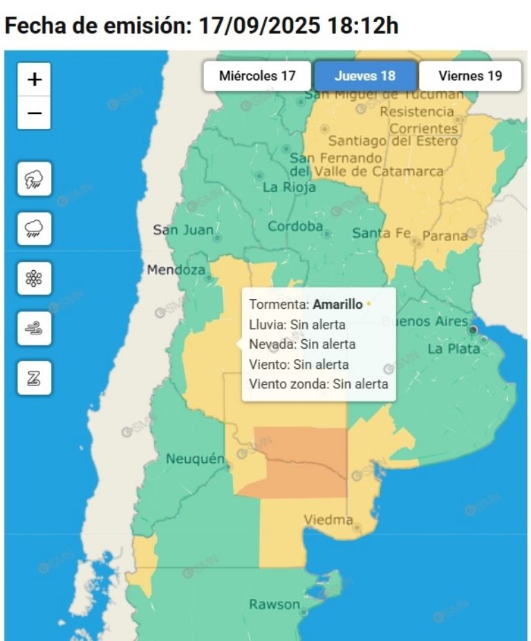 En el Sistema de Alerta Temprana del SMN, el color amarillo indica “posibles fenómenos meteorológicos con capacidad de daño y riesgo de interrupción momentánea de actividades cotidianas”.