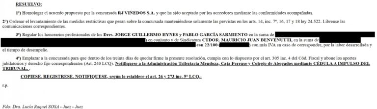 En medio de un contexto complejo en el que otras bodegas intentan salir de la crisis, RJ Viñedos SA consiguió que se homologue una propuesta de acuerdo con acreedores.