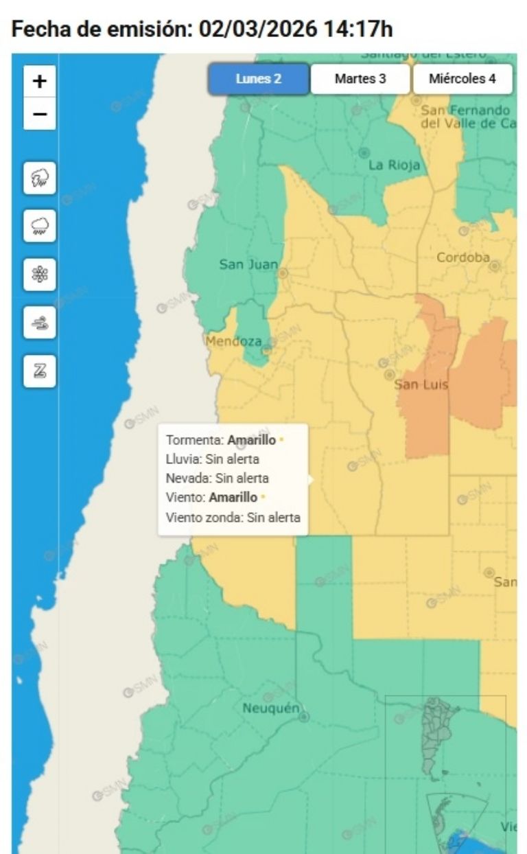 El Servicio Meteorológico Nacional mantenía tres alertas amarillas para Mendoza.