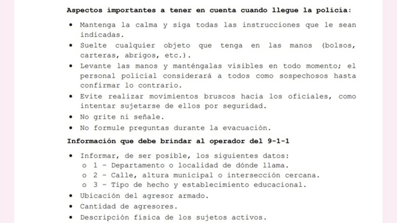 - Levante las manos y manténgalas visibles en todo momento; el personal policial considerará a todos como sospechosos hasta confirmar lo contrario.