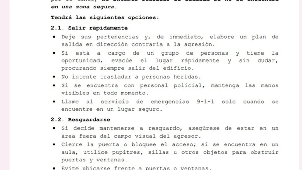 - Cierre la puerta o bloquee el acceso; si se encuentra en un aula, utilice pupitres, sillas u otros objetos para obstruir puertas y ventanas.