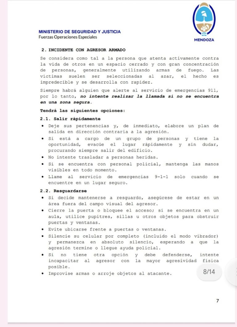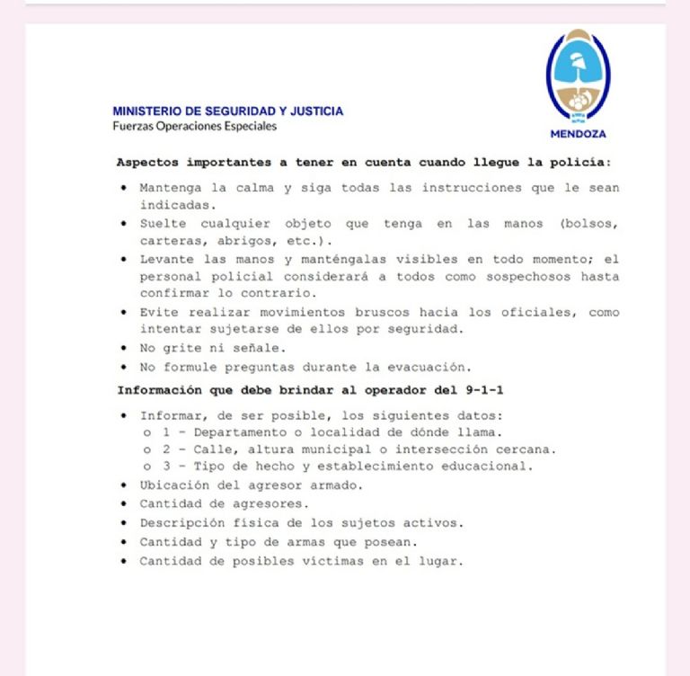 Debido a la cantidad de casos que se denunciaron sobre alumnos que amenazaban con realizar tiroteos en las escuelas y a que hasta el viernes se habían registrado 50 casos en Mendoza, hoy la Dirección General de Escuelas (DGE); distribuyó un protocolo para que los docentes apliquen frente a distintas situaciones. El mismo fue realizado por el Ministerio de Seguridad y Justicia, más concretamente por las Fuerzas de Operaciones Especiales.