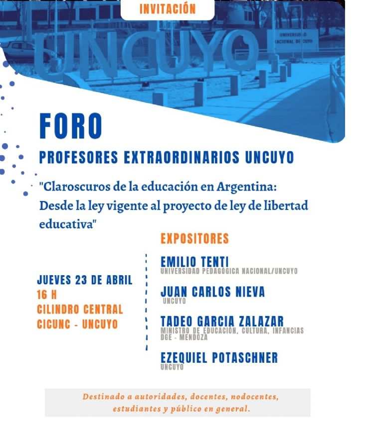 Emilio Tenti Fanfani, Juan Carlos Nieva y Ezequiel Potaschner, debatirán junto al ministro de Educación Tadeo García Zalazar sobre los Claroscuros de la educación en Argentina.Desde la ley vigente hasta el proyecto de ley de libertad educativa.